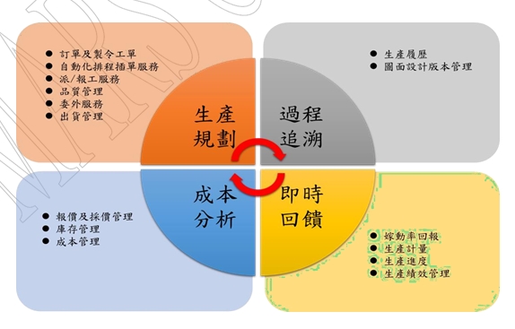 排程服務為主要的核心功能,可依物料、歷史紀錄及經驗預設工時後進行工單排程,排程中會參考各工站小排程,如裁切程序、重工程序、委外程序…等小排程服務,整個生產排程再依各工站報工優化,生產常遇到的插單,也會考良目前正在生產的工單,即時排入生產管理系統。